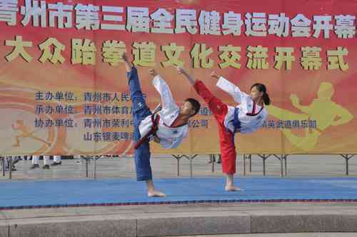 5月19日上午,青州市第三届全民健身运动会开幕暨全民健身月活动在东夷文化标志园启动,来自全市的20余支代表队共1000余人参加了开幕式。据悉,作为大型群众性体育盛会,此次全民运动会将陆续开展乒乓球、台球、门球、象棋等群众喜爱的传统体育项目角逐,活动将持续到十月份,对进一步促进全民健身运动的广泛开展、增强广大群众的身体素质、加快群众体育事业的发展具有重要意义。图①为柔力球表演;图②为跆拳道表演。 林庆民摄