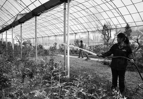 中华盆景园总投资1.5亿元,已有48家花卉企业落户。今年以来,弥河镇突出抓好中华盆景园的规范提升工作,建立花卉发展区管理办公室,完善基础设施,提升花棚建设标准,加快花棚搭建进度,全力打造集花卉生产、展示、交易于一体的花卉产业发展区。图为花棚内工作人员正在给盆景浇水。 韩东涛 平萍摄