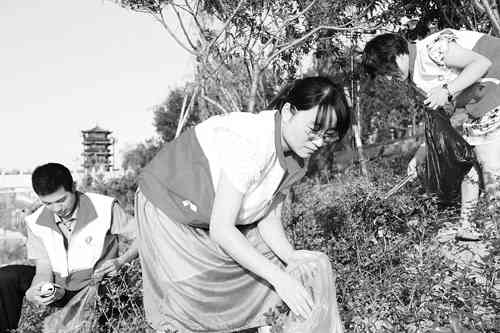 潍坊市益都中心医院的青年志愿者经常利用节假日和工余时间走进社区农村,劝导不文明行为,宣传保护环境的重要性,唤起更多的人加强文明素养,主动参与到创建优美环境的志愿行动中来。图为近日该院志愿者冒着高温,来到青州市南阳河畔,捡拾堤坝和绿化带中的垃圾。 董波 赵红燕摄