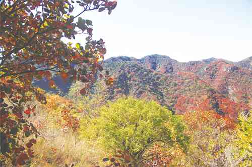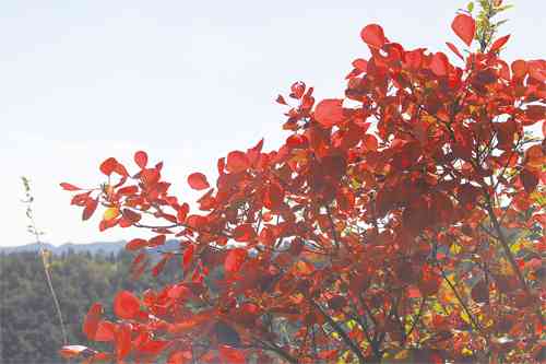 一路上,美景不断出现。秋天的山,更坚毅,更苍凉,像一个个中年男子的模样;秋天的树,没了夏天的绿汪汪,或粗或细的树干上,有的是黄叶摇摇欲坠,只待冬天的银装素裹;有的是枯叶落尽,留下一树的黄金灿灿,那是柿子,一树红果,那是山楂。最美的还是那一棵棵,一簇簇红的如火的红叶。