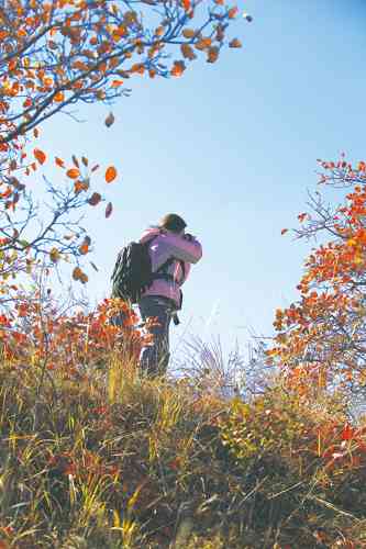 沿着如蛇般曲折的九龙盘往山顶走去,路边不时有游客在驻足观看,一个个兴奋的发红的脸,像极了那一片片红叶。走到一半,一棵红绿相间的大树像俊俏的迎宾站在路边,探着身子,仿佛要告诉我们什么。工作人员介绍,这是红叶的一种,叫五角枫,这是江北最大的一棵,在这里已经生长了几百年了,过几天才是它最红的时刻。