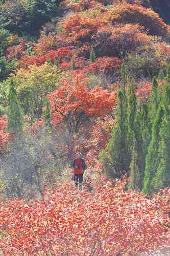 仰天山的植被非常丰富,挺拔高细的槐树,叶子已落的差不多了,四季常青的松柏,还是一如既往的绿着,但它们,在这个季节,都是陪客,红色,才是仰天山秋天的主人。