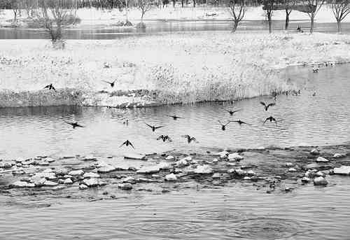 是的,冬日的弥河从来不缺乏生机:踩过一条冰雪稍融的小径,露出的黄色草皮有着青色的草根;登上一座吱呀作响的木结构小桥,惊起的鸟雀扑棱着飞走,向雪野更深处去觅食;远望一座四角尖尖的仿古亭,在枝丫的掩映下,有一对璧人的剪影,窃窃私语状,却又有着难掩的爱意涌动;而那闪着波光的河面上,竟还有长着白羽长颈的天鹅,不惧严寒的正在戏水觅食……