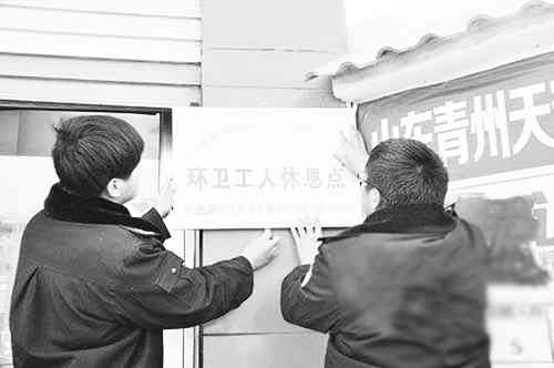 本报讯 (记者郭庆滨 通讯员曾宪升)2013年12月27日下午,青州市第一批挂出30块“环卫工人休息点”的标志牌。关爱环卫工人,设置休息点,这让辛苦劳作的环卫工人有了一个喝水、取暖、休息的固定场所。