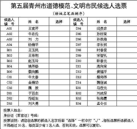5、选票请寄(送)至:青州市道德模范评选委员会办公室(青州市市级机关综合办公大楼425室),邮编:262500。