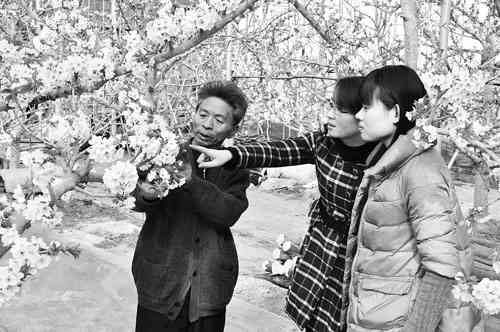 近日,弥河镇万余亩大棚中的樱桃花已悄然盛开,一簇簇雪白的樱桃花含苞吐蕊,缀满枝头,烂漫若云。近年来,弥河镇积极鼓励农民樱桃等特色农业作物,目前已发展“红灯”、“美早”等品种优良、市场销售抢手的樱桃近万亩。据了解,正常的樱桃每年5、6月份才开始上市,而大棚樱桃3月底4月初即可上市,市场价格比较高,有效带动了当地农民增收致富。图为赵疃村樱桃种植户向慕名而来的游客展示洁白如雪的樱桃花。 王福涛 刘志涛 刘娜摄