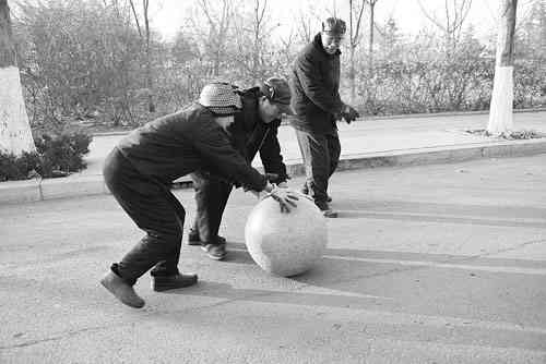 随后,三位老人,深弯着腰,使出全身力气,滚动起这个百公斤左右的大理石球。因向西将石球返回的路中,都是上坡路,这对于三位年龄均60多岁的人老人来说,确实不是一件容易的事,再加上,他们怕滚动时将大理石墩表面弄损,影响它的美观,所以一路特别小心,这无疑也加大了前进的难度,很快,他们额头上便渗出了汗珠,并顺着脸颊往下流。