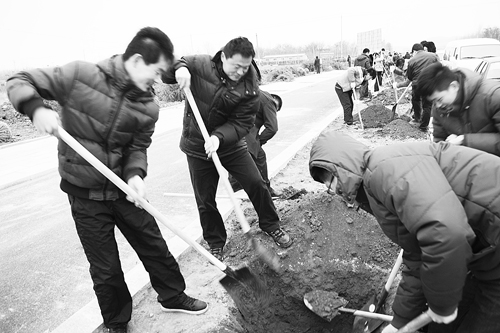 3月12日,潍坊市益都中心医院团委组织团员青年、青年志愿者到昭德南路与新南环路交叉路口参加了我市绿色植树活动。初春时节,乍暖还寒,但同志们挥锨抡镐,干得热火朝天,为建设“绿色青州、生态青州”奉献了自己的一份力量。图为植树现场。 赵红燕摄